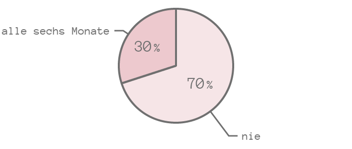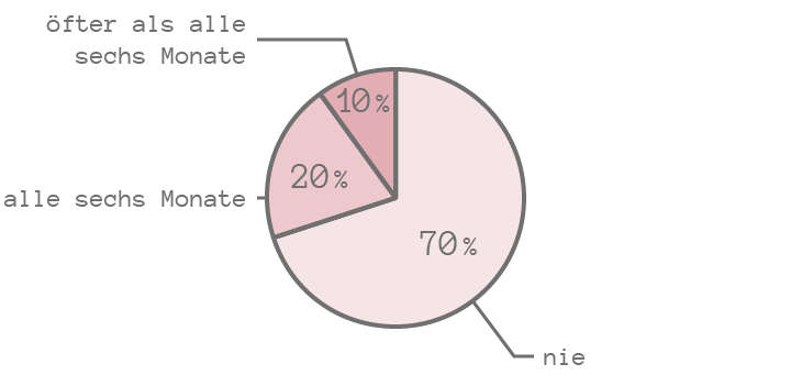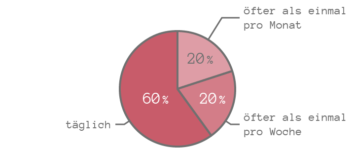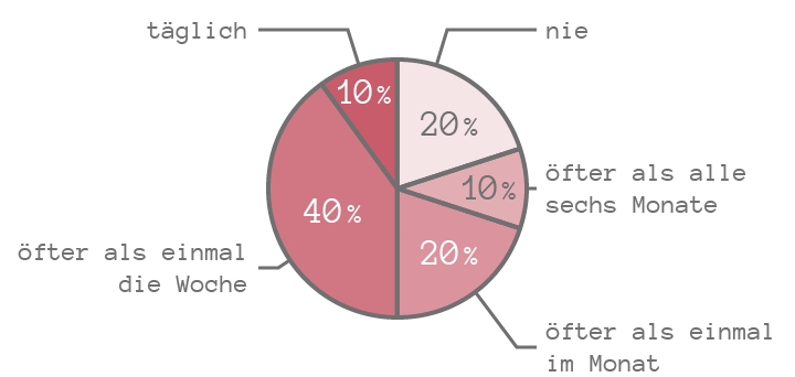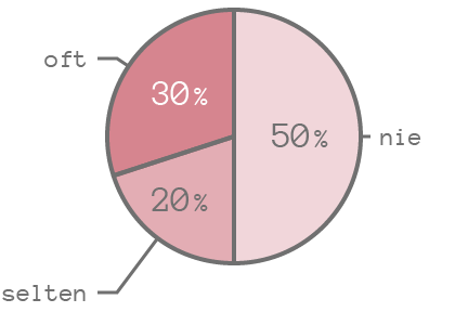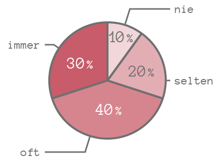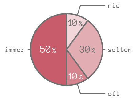 Wenn man die Prozentzahlen verkleinert, passen die Texte passen zwar in das Diagramm, müssen allerdings in manchen Fällen gedreht werden, was die Lesbarkeit verschlechtert. (Die Begriffe „oft“ und „nie“ sind hier auch gedreht, das wäre natürlich nicht notwendig.)
