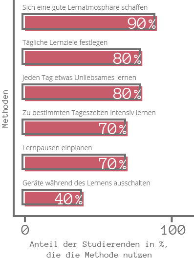 Die beliebteste Methode der Studierenden ist, sich eine gute Atmosphäre für das Lernen zu schaffen. So legt die Hälfte aller Studierenden besonderen Wert darauf, dass sie während der Lerneinheit etwa ein warmes Getränk genießen kann (immer: 50 %).