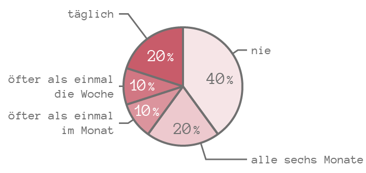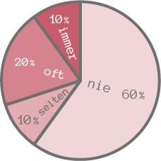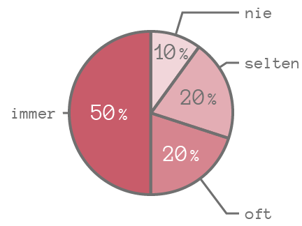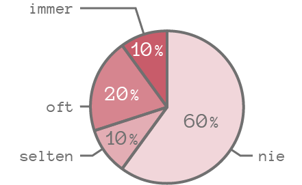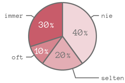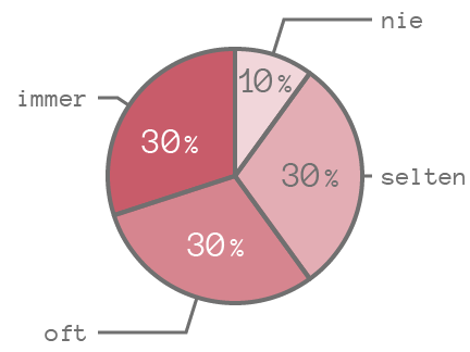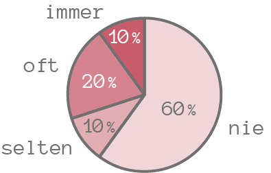 Wenn man die Prozentzahlen verkleinert, passen die Texte passen zwar in das Diagramm, müssen allerdings in manchen Fällen gedreht werden, was die Lesbarkeit verschlechtert. (Die Begriffe „oft“ und „nie“ sind hier auch gedreht, das wäre natürlich nicht notwendig.)