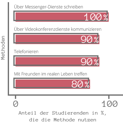 Da Treffen in größeren Gruppen über eine lange Zeit nicht möglich waren, sind die Studierenden zunehmend auf digitale Alternativen umgestiegen. Positiv ist, dass durch die neu entdeckten technischen Möglichkeiten vermehrt auf Video-Calls zurückgegriffen worden ist. Dies erwies sich als besonders sinnvoll, um auch zu Freunden Kontakt aufnehmen zu können, die man aufgrund der Entfernung nicht oft sehen kann.