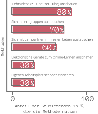 Am häufigsten wird hier auf Lehrvideos (z. B. auf YouTube) zurückgegriffen: Die Hälfte der Studierenden schaut sich mehrmals in der Woche Lehrvideos an (> 1x wöchentlich: 40 %; täglich: 10 %).
